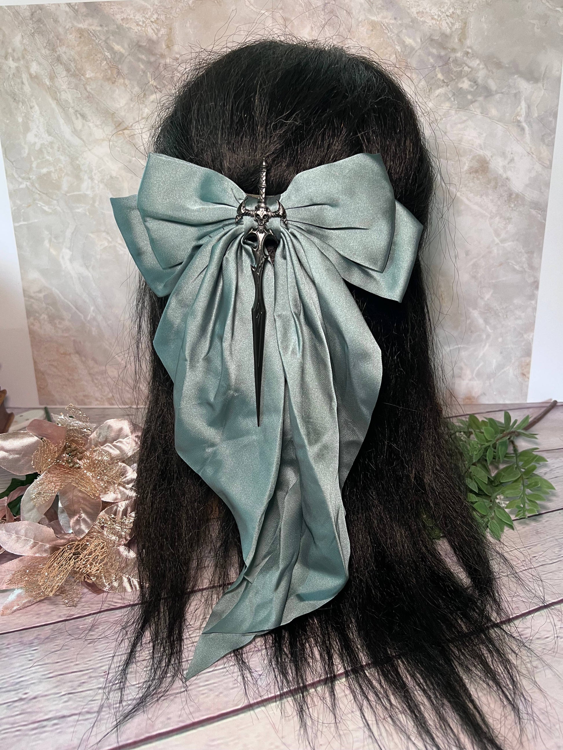 These come in a variety of colors of bows and swords/axes. They are oversized and a perfect accessory. The backing is a clip barrette